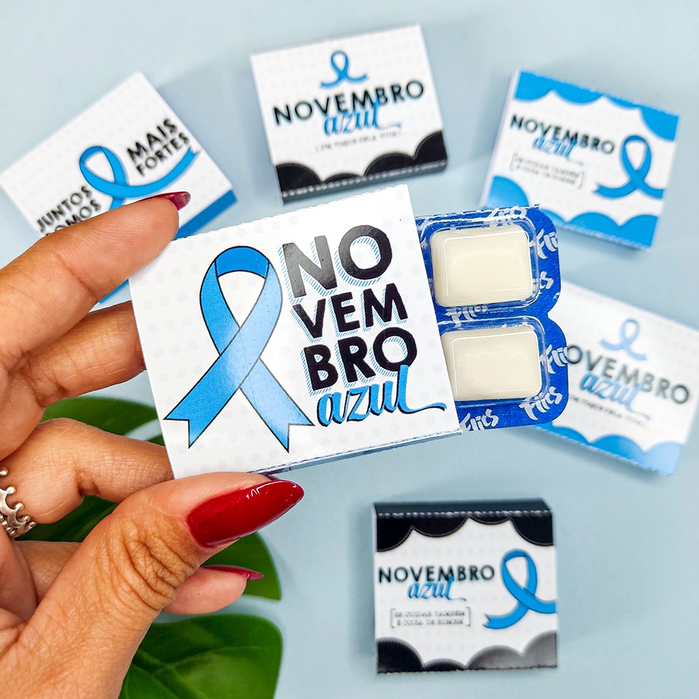 Cada cartela contém unidades de chiclete embaladas com arte personalizada temática do Novembro Azul, reforçando a mensagem de cuidado e autoconsciência de forma leve e agradável.